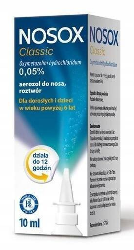Lek Nosox Classic, 0,05%, aerozol do nosa stosuje się w obrzęku błon śluzowych występującym w ostrym zapaleniu błony śluzowej nosa, naczynioruchowym zapaleniu błony śluzowej nosa, alergicznym zapaleniu błony śluzowej nosa, zapaleniu zatok przynosowych, zapaleniu trąbki słuchowej, zapaleniu ucha środkowego.