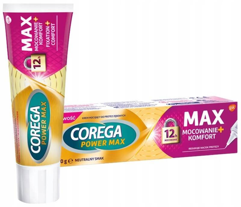 Corega Power Max Mocowanie + Komfort to krem mocujący do protez zębowych, gwarantujący stabilne utrzymanie protezy do 12 godzin po jej założeniu. Dodatkowo formuła kremu pomaga chronić dziąsła przed naciskiem protezy, tarciem oraz podrażnieniami, co znacząco podnosi codzienną wygodę jej noszenia.