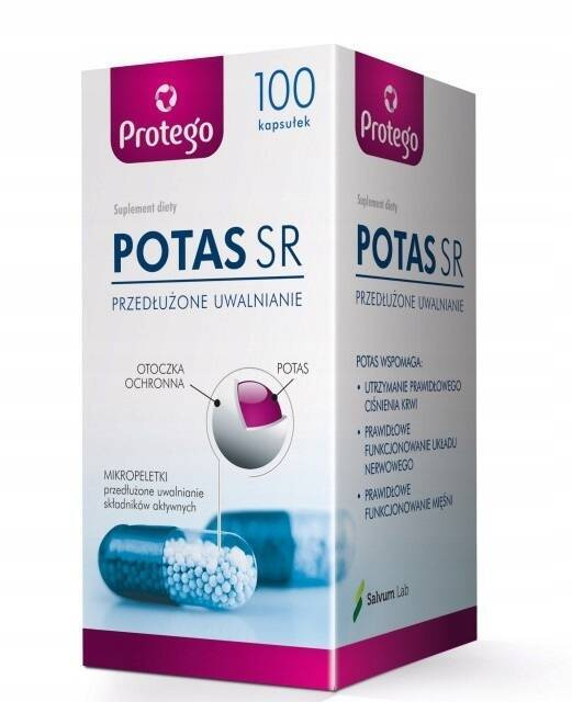 Suplement diety Protego Potas SR przeznaczony jest do stosowania w celu pokrycia zapotrzebowania organizmu na potas (niedobory potasu mogą objawiać się m.in. uczuciem zmęczenia, niepokojem, skurczami mięśni, zawrotami głowy, kołataniem serca.)